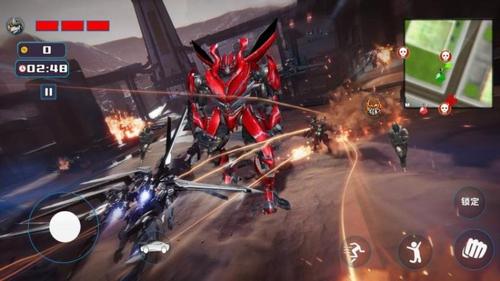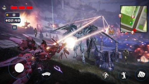 4、战斗中合理使用闪避键躲避敌方火力,并根据战场局势触发机甲变形(如步行转飞行、坦克形态展开),突破困境。