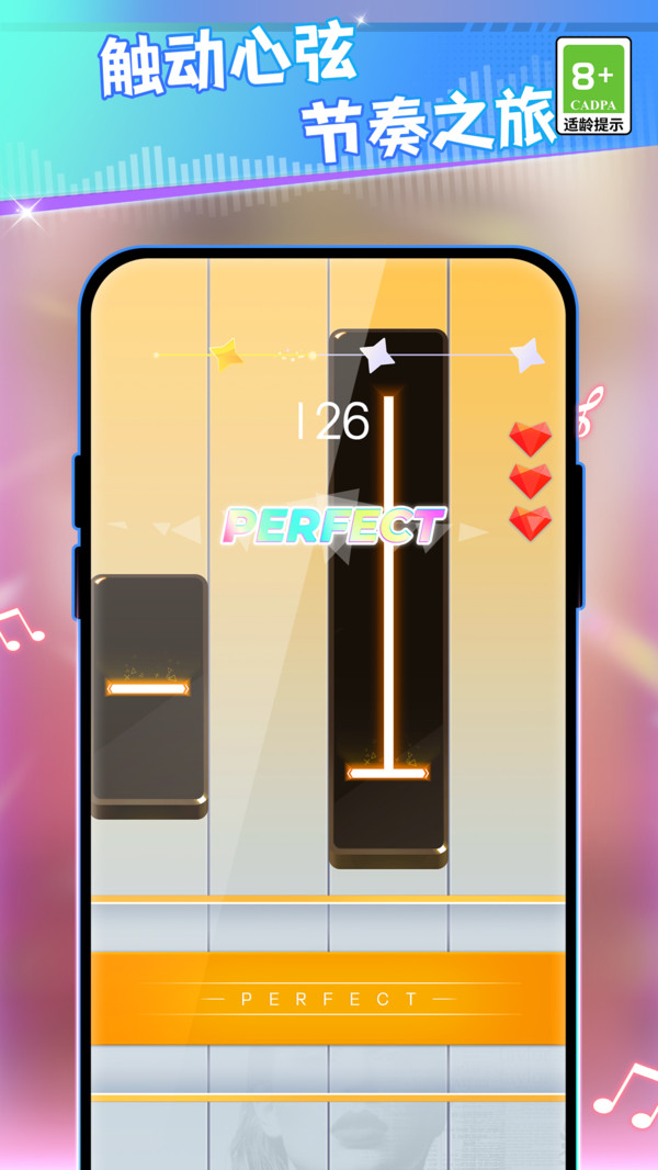 2、难度关卡对应不同节奏密度,高阶关卡钢琴块下落速度更快、排布更复杂,考验玩家极限反应。