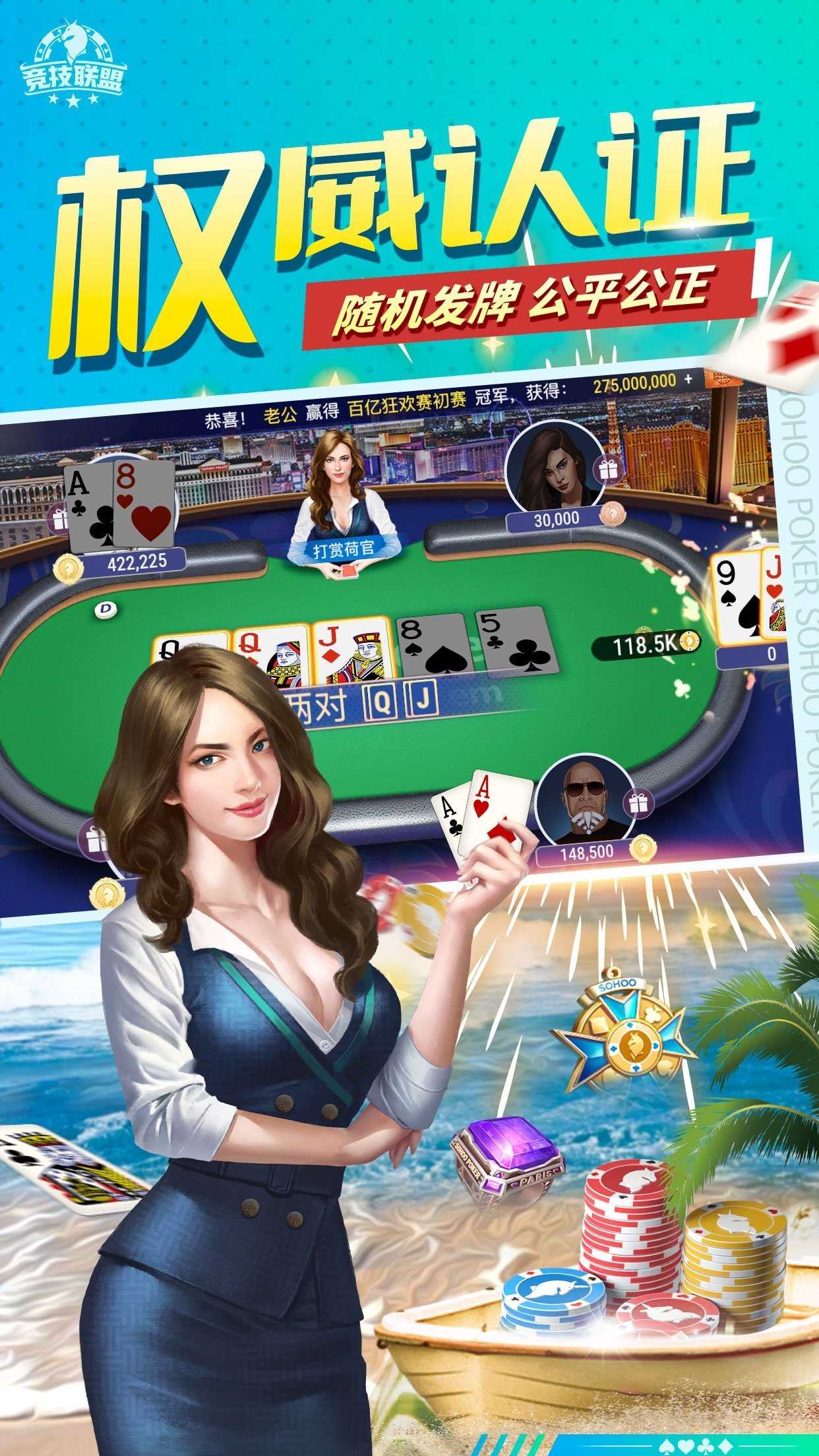 德州竞技联盟手游稳定流畅的掌上游戏,优质的系统匹配功能,让你遇到实力相当的对手,移植经典棋牌风格,打造独特环境,竞技休闲两不误!